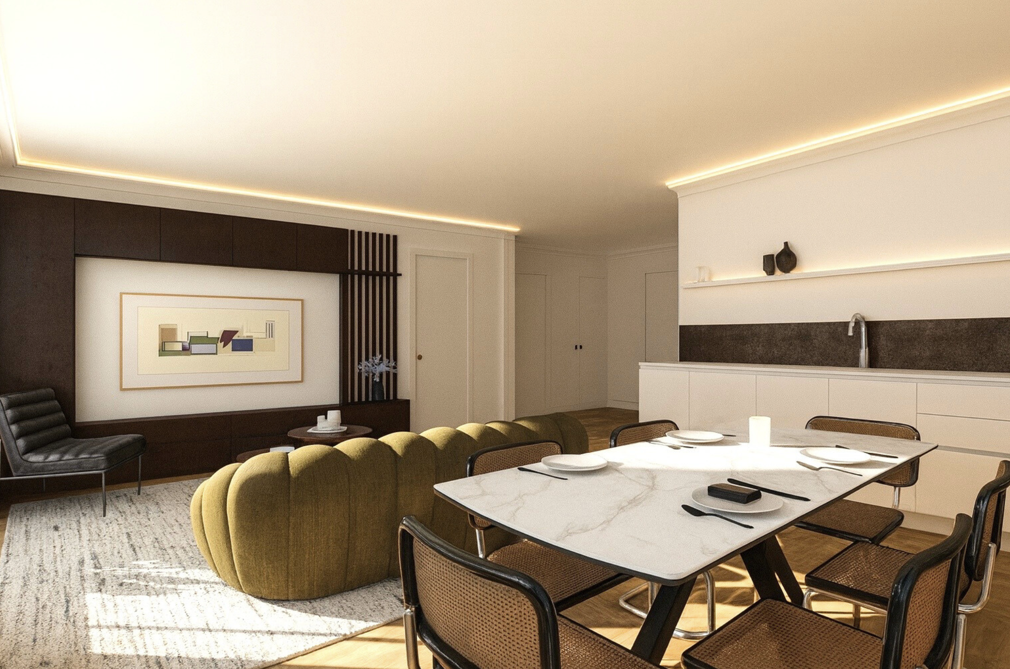 Situé au cœur du 16ᵉ arrondissement, l’appartement bénéficie d’une architecture élégante et lumineuse, que nous avons mise en valeur à travers une ambiance contemporaine et raffinée, fidèle à l’esprit parisien.